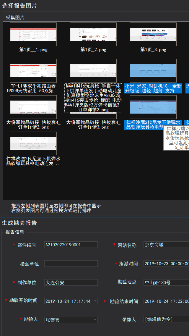 可以自動生成勘驗報告。填寫必要的報告信息,可以批量選中截圖插入到報告中,截圖順序支持手動排序,并自動生成報告。